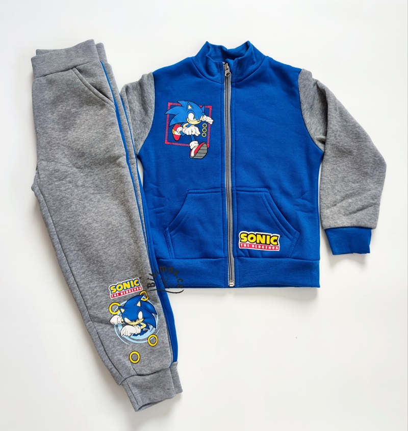 Mikina se zapínáním na zip s naželovačkou, rukávy jsou zakončeny pružnými náplety. Kalhoty s nažehleným Sonicem, mají dvě boční kapsy a nohavice jsou zakončeny pružnými náplety.