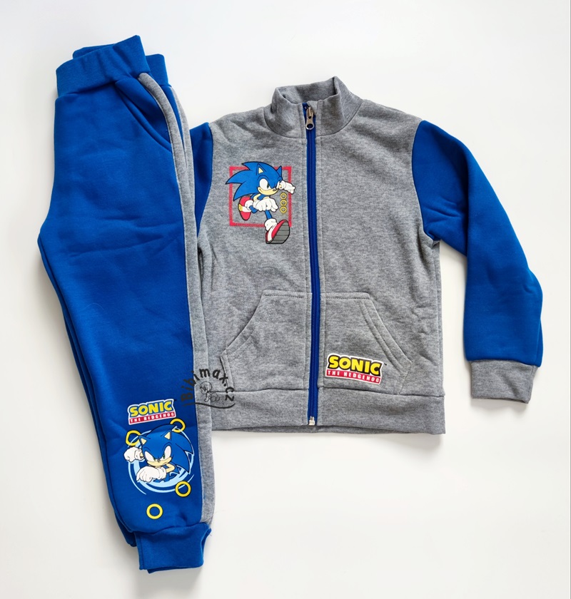 Mikina se zapínáním na zip s naželovačkou, rukávy jsou zakončeny pružnými náplety. Kalhoty s nažehleným Sonicem, mají dvě boční kapsy a nohavice jsou zakončeny pružnými náplety.