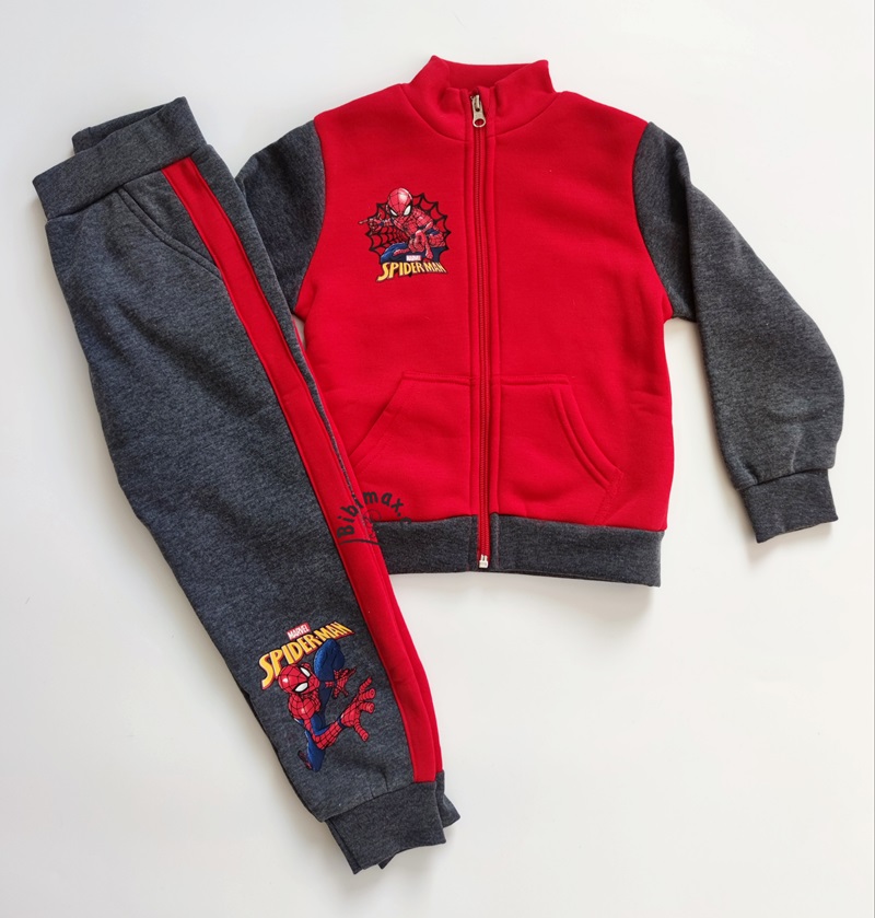Mikina se zapínáním na zip s naželovačkou, rukávy jsou zakončeny pružnými náplety. Kalhoty s nažehleným Spidermanem, mají dvě boční kapsy a nohavice jsou zakončeny pružnými náplety.