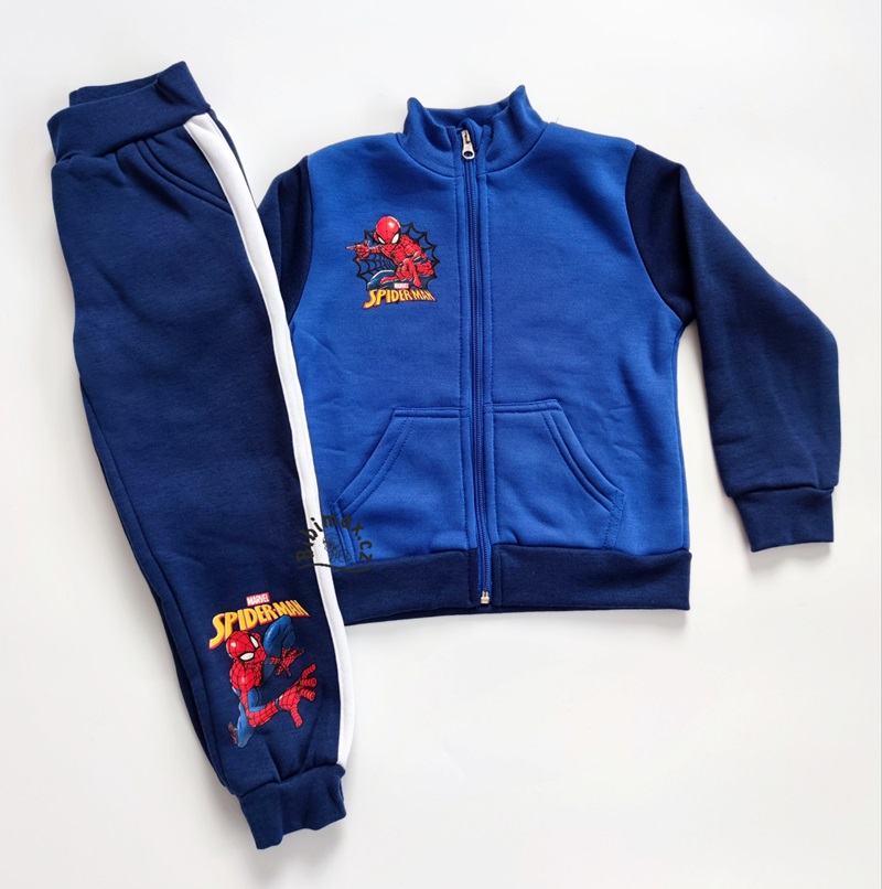 Mikina se zapínáním na zip s naželovačkou, rukávy jsou zakončeny pružnými náplety. Kalhoty s nažehleným Spidermanem, mají dvě boční kapsy a nohavice jsou zakončeny pružnými náplety.