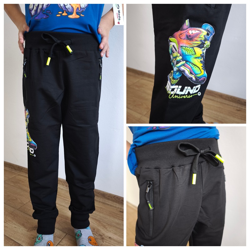 Moderní chlapecké tepláky s originálním potiskem boty zaujmou na první pohled a stanou se oblíbeným kouskem každého malého sportovce. Skvěle se hodí do školy, na hřiště i pro domácí pohodlí.