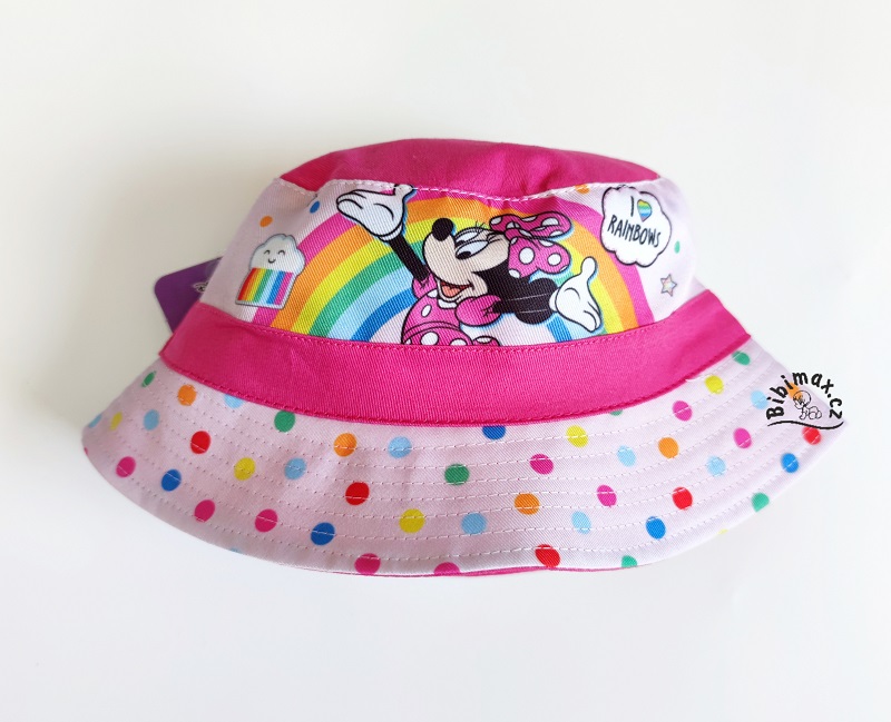 Stylový klobouček s oblíbenou disney MINNIE.  Hlavní část je bavlněná, potištěná část polyester.  Obvod 52 cm na obvod hlavy maximálně 52 cm, obdobně u obvodu 54 cm. Kloboučky jsou spíše menší.  celý popis