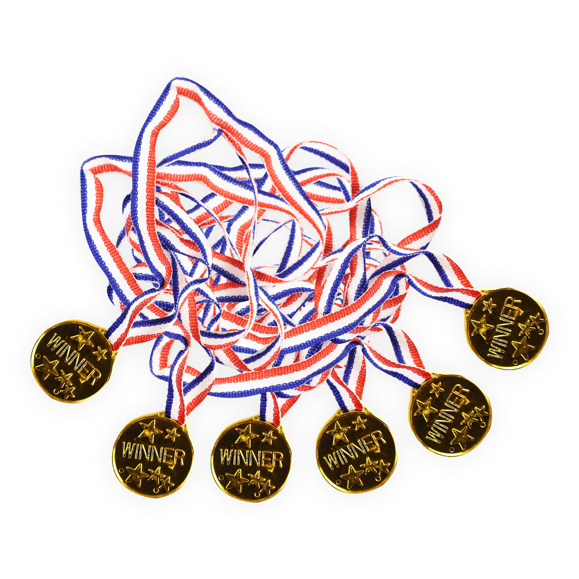 Oceň své kamarády opravdovými medailemi! Balení obsahuje 6 ks zlatých medailí na šňůrce v barvě trikolóry. Medaile jsou vyrobeny z PVC.