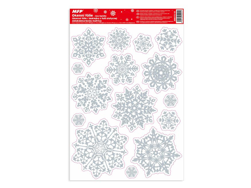 Vánoční okenní fólie s motivem sněhových bílých vloček s glitrem. Vyzdobte si okno těmito krásnými samolepkami. Jsou vhodné na jakékoli hladké plochy, například sklo, výlohy, zrcadla nebo kachličky. Čisté, bez lepidla a opakovaně použitelné.