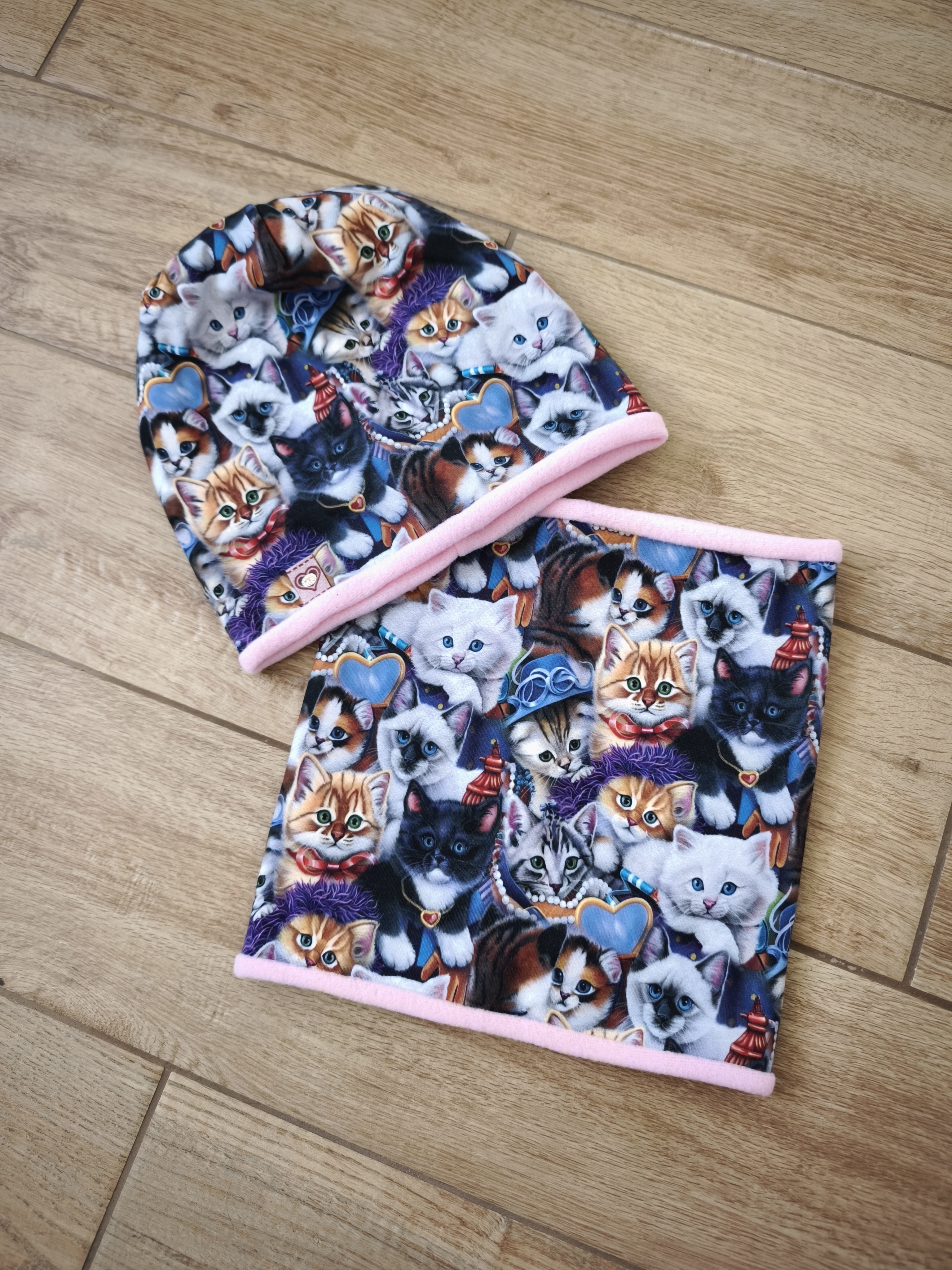 Stylový a hřejivý podzimní komplet pro dívky s KOČIČÍM motivem potěší každou malou parádnici! Sada obsahuje měkkou čepici a nákrčník, ideální pro chladnější dny.